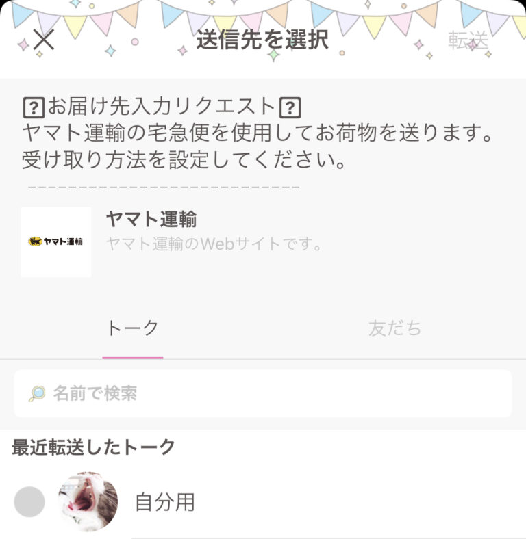クロネコヤマトで匿名配送・受取する方法By LF01 / 2022年11月10日 クロネコヤマトの「宅急便をスマホで送る」サービスを利用すればカンタンにできます。 ※ヤマト公式サイトには「LINE以外でのご利用はできません」と書いてありますが、コピペすればLINE以外でも可能です。 大まかな手順 ・クロネコヤマトの匿名で送る方法 匿名配送は一度LINEを経由しないといけないので、自分専用のグループを作って住所リクエストリンクをそこへ一時的に送れるようにします。クロネコメンバーズはヤマト運輸へ会員登録することです。クロネコメンバーズに登録しなくても匿名配送はできますが、その場合発送はヤマト直営店からのみ可能です。クロネコメンバーズは後でもいいですが、LINEのグループは必ず先に作成してください。すでに自分専用のグループを持っている場合は不要です。 ・LINEグループを作成する(荷物差出人作業) 手順1 ホーム右上の人のマークをタップ 手順2 グループを作成をタップ 手順3 友だちを選択せずに次へ 手順4 グループ名を入力して作成をタップ このとき、メンバーが自分しかいないことを確認します。もし誰か選択してしまっている場合は必ず選択を解除しましょう。これでLINEグループの作成ができました。 ・匿名で荷物を送る(荷物差出人作業手順1~9,11)(受取人作業手順10) ヤマトの匿名配送サービスはスマホからしか操作できないので、スマホからヤマト運輸へアクセスしてください。 手順1 宅配便をスマホで送るをタップ 手順2 クロネコメンバーズにログインする クロネコメンバーズへ事前に登録してなかった場合はここでも登録できます。 手順3 荷物を選ぶ 手順4 発払いか着払いを選ぶ 発払いは配送料金を荷物を送る人が負担する配送方法です。着払いは配送料金を荷物を受け取る人が負担する配送方法です。コンビニで送り状をもらう場合は、間違えないように注意してください。 手順5 荷物情報を入力する 手順6 LINEでリクエストする 手順7 発送予定日を指定する 発送予定日に荷物を送れなかった場合設定し直さないといけないので、確実に発送できる日程を選んだ方が良いです。 手順8 メッセージを入力する 必ず、「個人情報の公開設定」にチェックを入れてください。ここにチェックしないと匿名配送になりません。 手順9 URLを送る 「重要」 「LINEの友だちを選ぶ」から、最初に作った自分用のグループを作成し、そこへ貼り付けてください。 貼り付けたリンクをコピーして、荷物を送りたい相手にSNS等などのDMで送ってください。 手順10 相手(受取人)が住所を入力 受取人は、自分が受け取りたい場所を自分で入力します。 手順11 相手の入力メールが届いたら支払い&発送 受取人が入力を完了すると、クロネコメンバーズの登録メールに通知のメールが届きます。入力完了メールが届いたら、下記URLかクロネコメンバーズのページから発送手続きをしましょう。 ・荷物情報タブから入力完了の荷物を選択 「荷物情報」タブを開くと荷物一覧が表示されます。受取人が入力完了したものは「リクエスト入力完了」と表示されています。 ・発送場所の指定 発送場所は現在位置から選ぶことができます。匿名配送の場合、コンビニ(セブン、ファミマ)ヤマト営業所になります。※ゲスト利用の場合、ヤマト営業所のみの発送になるので注意です! ・代金支払い 後は代金を支払って発送場所に持っていき、表示されたバーコードまたは2次元コードを提示してください。これで発送完了です。もちろんクレカや他の決済手段も選べます! 以上が匿名配送・受取する方法となりますのでご活用ください。 ライバーエージェンシー「リベラフォース」では、ライブ配信者「ライバー」の新規募集をしています。✔︎自分も配信してみたいがイマイチわからない(どの配信アプリがいいの)✔︎ライブ配信で稼ぐためにノウハウを学びたい(本当に稼げるの)✔︎自分の活動の幅を広げたい(どんな人がライバーしてるの)また、「リベラフォース」では、ライブ配信に意欲的なライバーの方々の活動をサポートしています。フリーでやるより長く続けれるサポート体制あり所属ライバー限定のノウハウあり弊社独自の特典多数!!*ノルマや契約金など、金銭の支払いは一切ございません。すべてオンラインでやりとりが出来ます。まずはお気軽にライバー応募をしてみてください。↓↓今すぐライバー応募してみる↓↓ ライバー登録は公式LINEから